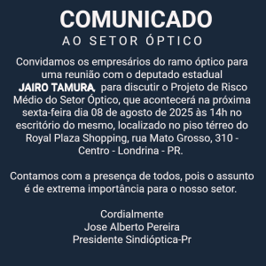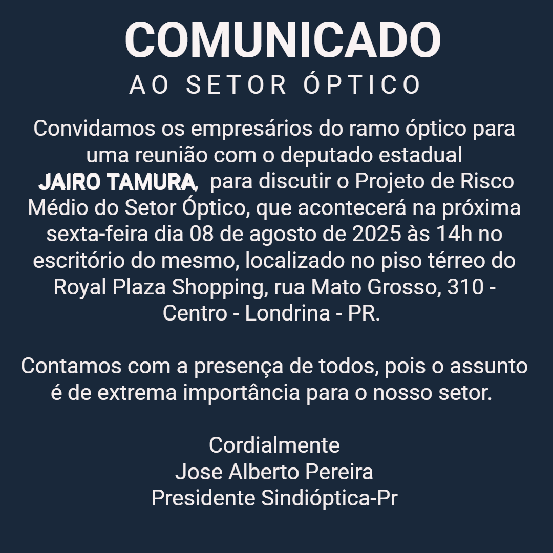Convidamos os empresários do ramo óptico para uma reunião com o deputado estadual JAIRO TAMURA, para discutir o Projeto de Risco Médio do Setor Óptico, que acontecerá na próxima sexta-feira dia 08 de agosto de 2025 às 14h no escritório do mesmo, localizado no piso térreo do Royal Plaza Shopping, rua Mato Grosso, 310 – Centro – Londrina – PR. Contamos com a presença de todos, pois o assunto é de extrema importância para o nosso setor. Cordialmente Jose Alberto Pereira Presidente Sindióptica-Pr