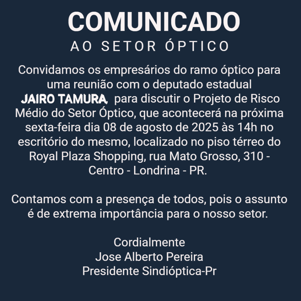 JAIRO TAMURA, para discutir o Projeto de Risco Médio do Setor Óptico, que acontecerá na próxima sexta-feira dia 08 de agosto de 2025 às 14h no escritório do mesmo, localizado no piso térreo do Royal Plaza Shopping, rua Mato Grosso, 310 – Centro – Londrina – PR.